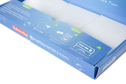 Melt is free from harmful chemicals and plastic packaging. It's very light and can be posted through your door. It contains tiny eco-cleaners, natural enzymes, and light natural fragrances. It’s a zero-waste product that doesn’t leave any residue in your machine or on your clothes.